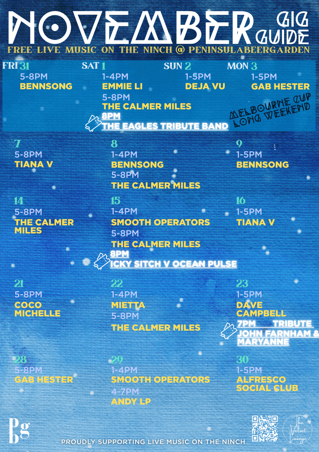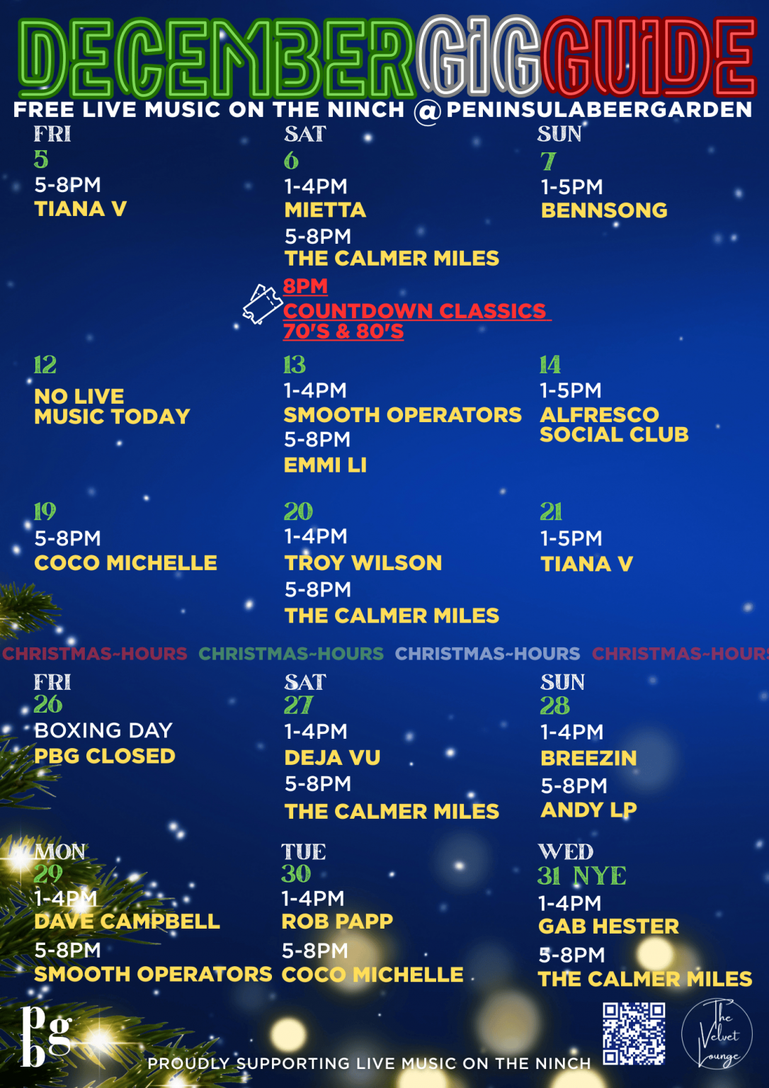 PENINSULA BEER GARDEN we are a cashless facility and only accept card transactions. We are also a walk in Venue with plenty of space, so bookings are not required Kitchen Service Lunch 11:30am-3:30pm Dinner 5:30pm-7:30pm Click here to book for the ICKY/OCEAN Show Click here to book for Whispering Jack Click here to book for Countdown Classics