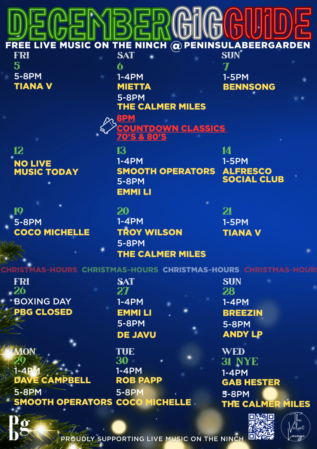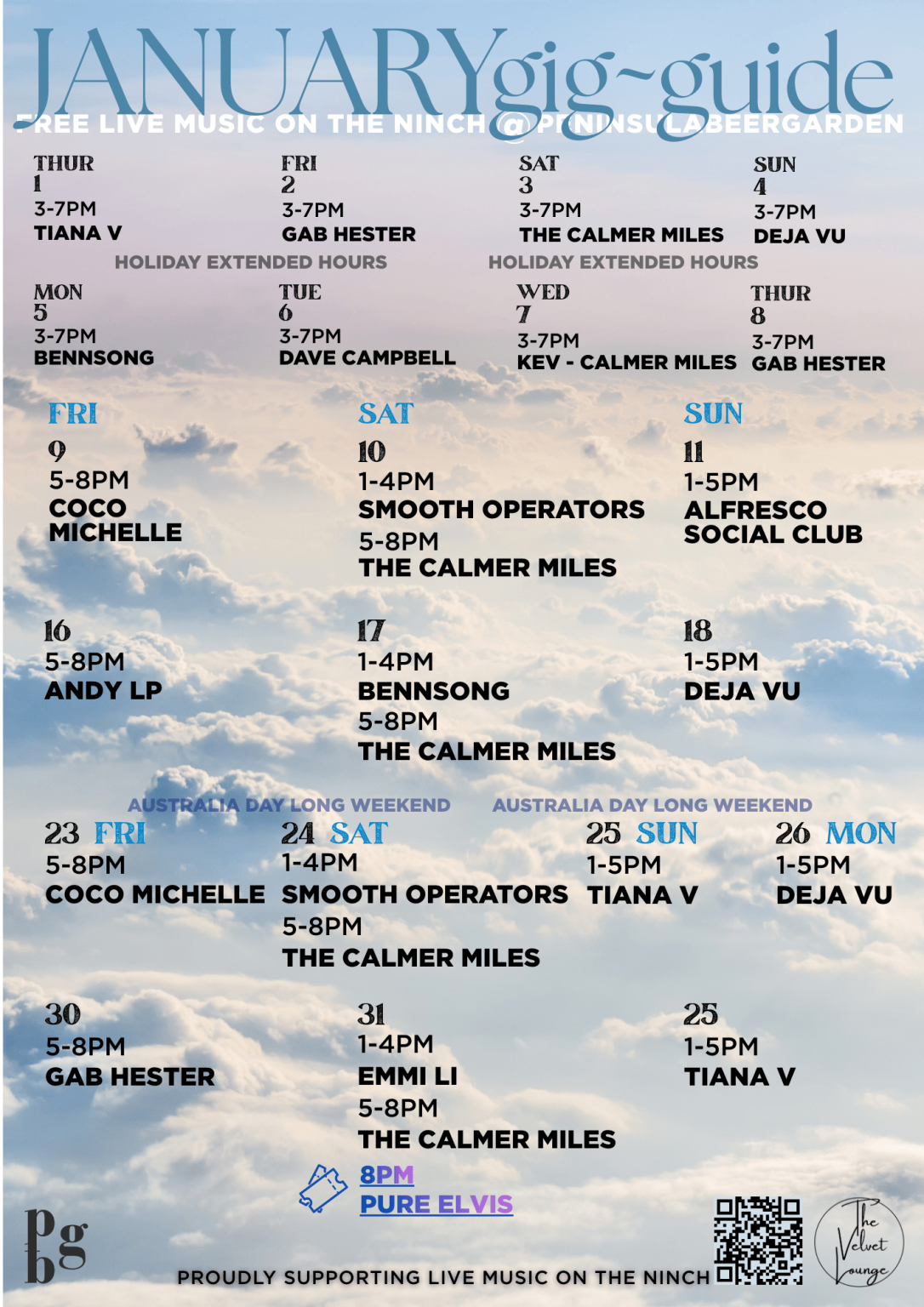 PENINSULA BEER GARDEN we are a cashless facility and only accept card transactions. We are also a walk in Venue with plenty of space, so bookings are not required Kitchen Service Lunch 11:30am-3:30pm Dinner 5:30pm-7:30pm Click here to book for Pure Elvis Click here to book for Gab Hester Click here to book in for the Neil Diamond Tribute Click here to book for the Simply the Best Show
